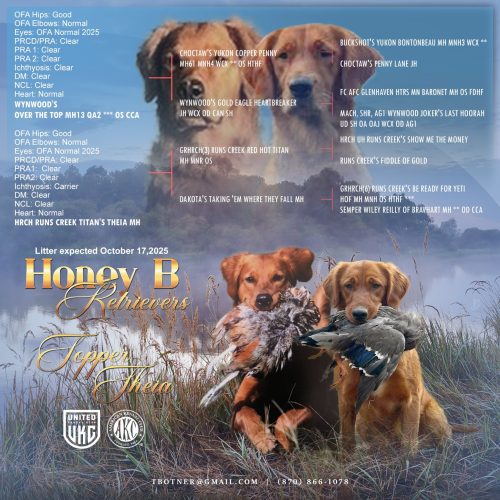 This litter is due to be born the middle of October 2025. The breeder, Theresa is honest, knowledgeable and raises puppies with great care. Theresa’s female Theia, was bred to my male Topper. You can read about Topper under the Boys button on this website. Please contact Theresa directly if you may be interested in a puppy tbotner@gmail.com 870-866-1078